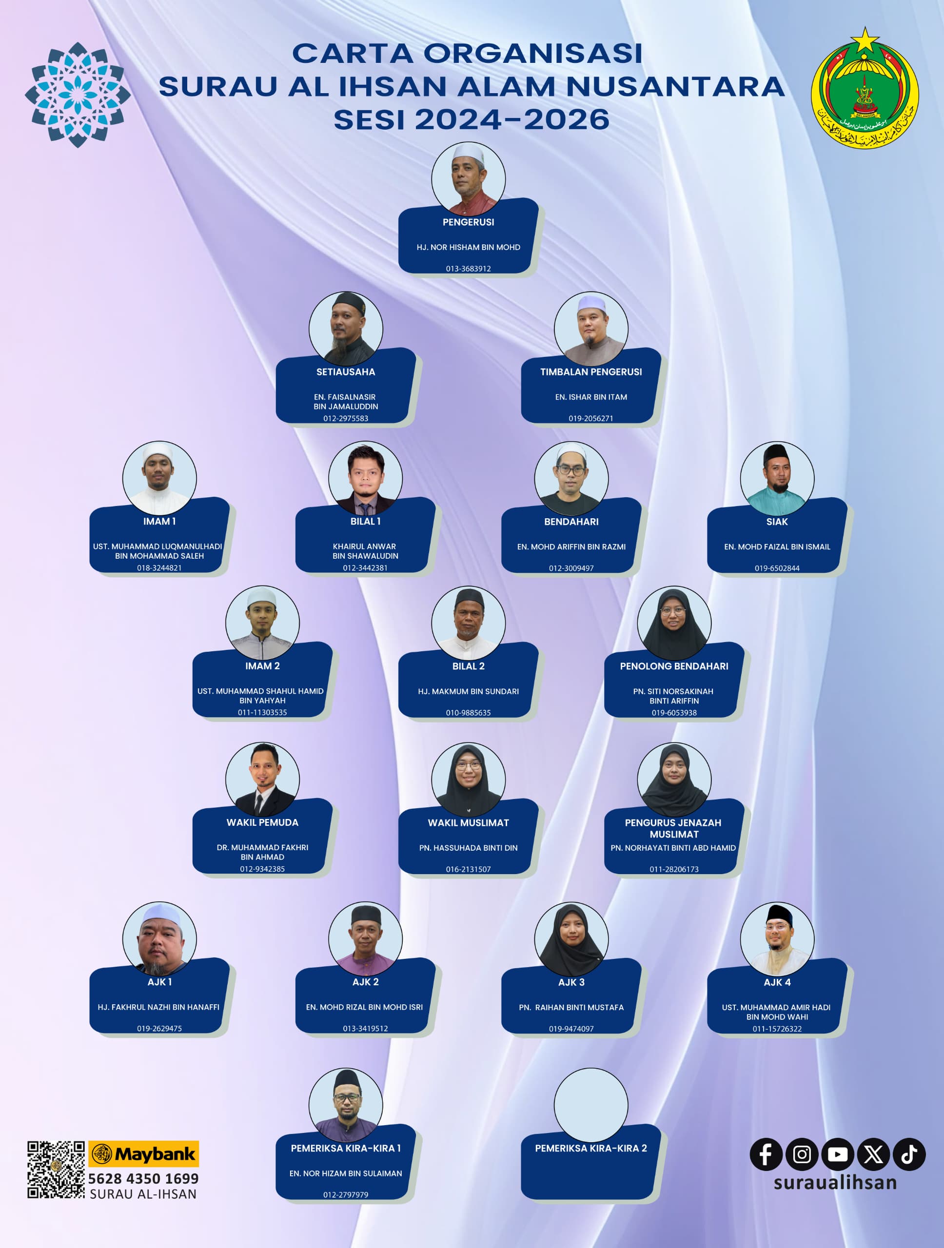 Setiap jawatan memainkan peranan penting dalam merancang dan melaksanakan aktiviti seperti solat berjemaah, kelas agama, ceramah, dan program kebajikan untuk manfaat masyarakat sekitar. Dengan struktur organisasi yang teratur, Surau Al-Ihsan terus komited untuk menjadi pusat pembangunan rohani dan sosial umat Islam.